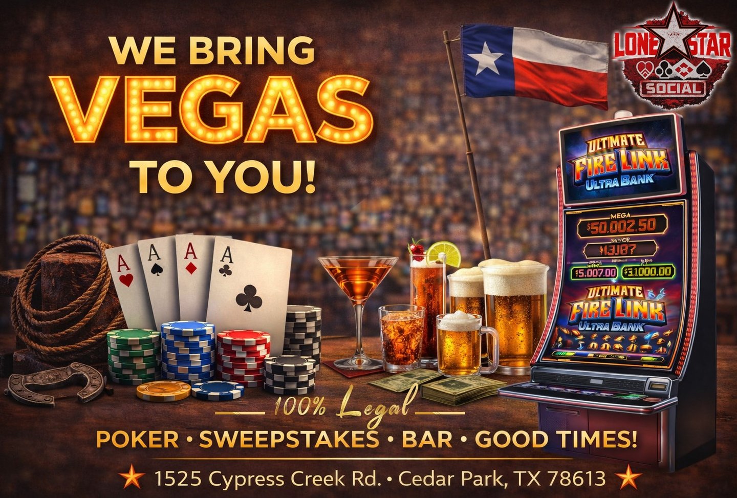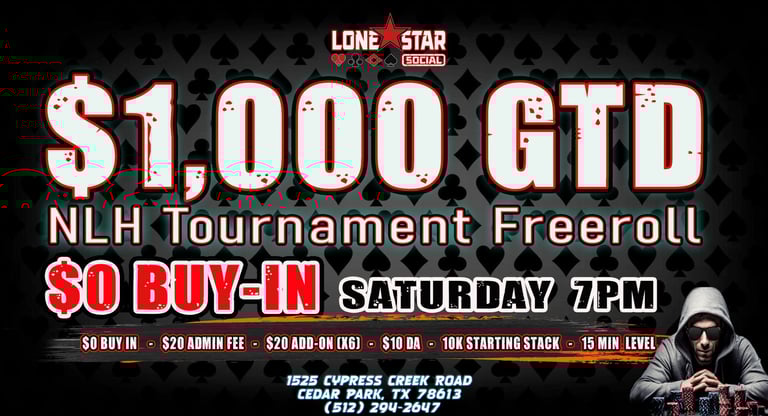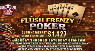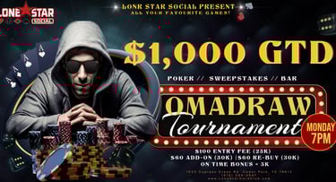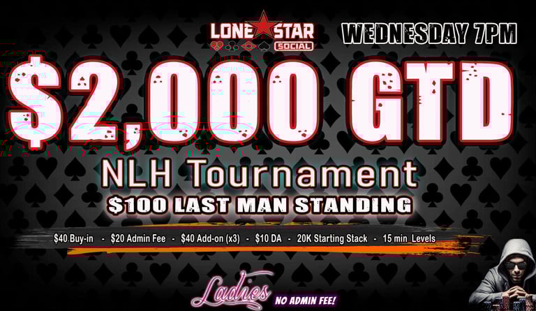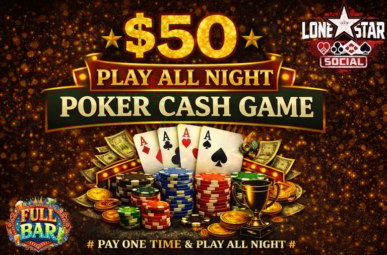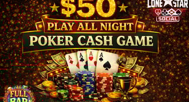 Are you ready to test your skills, bluff your way to victory, and win BIG? Look no further! Lone Star Social invites you to join us for an unforgettable gaming experience. Whether you're a seasoned pro or a beginner, there's a seat at the table just for you. Cash games and Poker Tournaments.