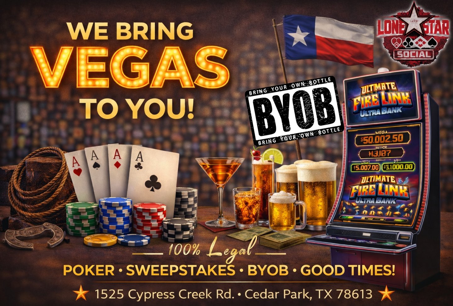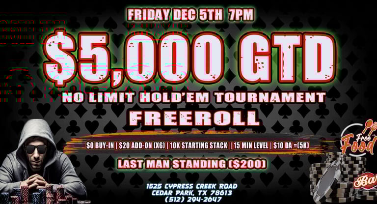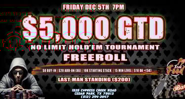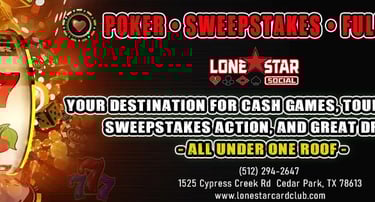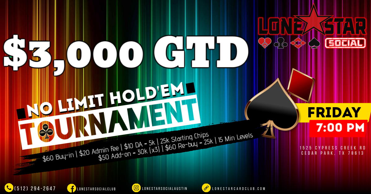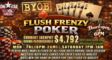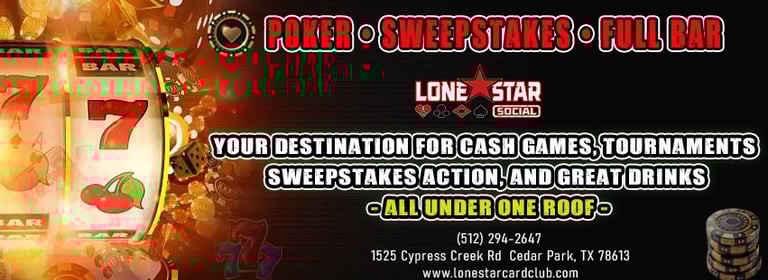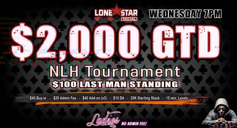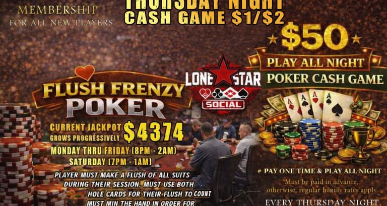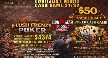 Are you ready to test your skills, bluff your way to victory, and win BIG? Look no further! Lone Star Social invites you to join us for an unforgettable gaming experience. Whether you're a seasoned pro or a beginner, there's a seat at the table just for you. Cash games and Poker Tournaments.