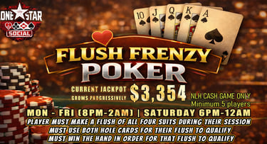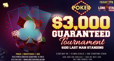 Are you ready to test your skills, bluff your way to victory, and win BIG? Look no further! Lone Star Social invites you to join us for an unforgettable gaming experience. Whether you're a seasoned pro or a beginner, there's a seat at the table just for you. Cash games and Poker Tournaments.